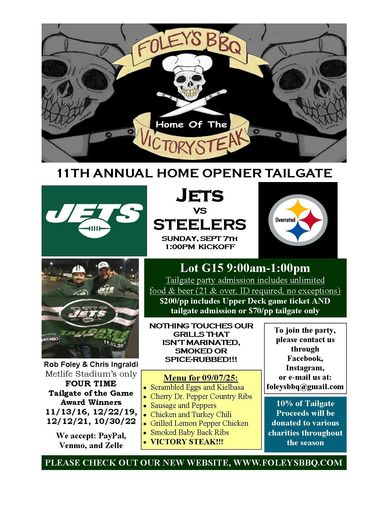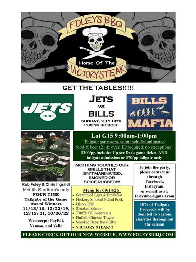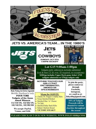 Join us at MetLife Stadium for any of the New York Jets games played at MetLife in 2025. Groups welcome, from 2 people to 100 people. See you at section G15 in the parking lot! (Just look for the flags)